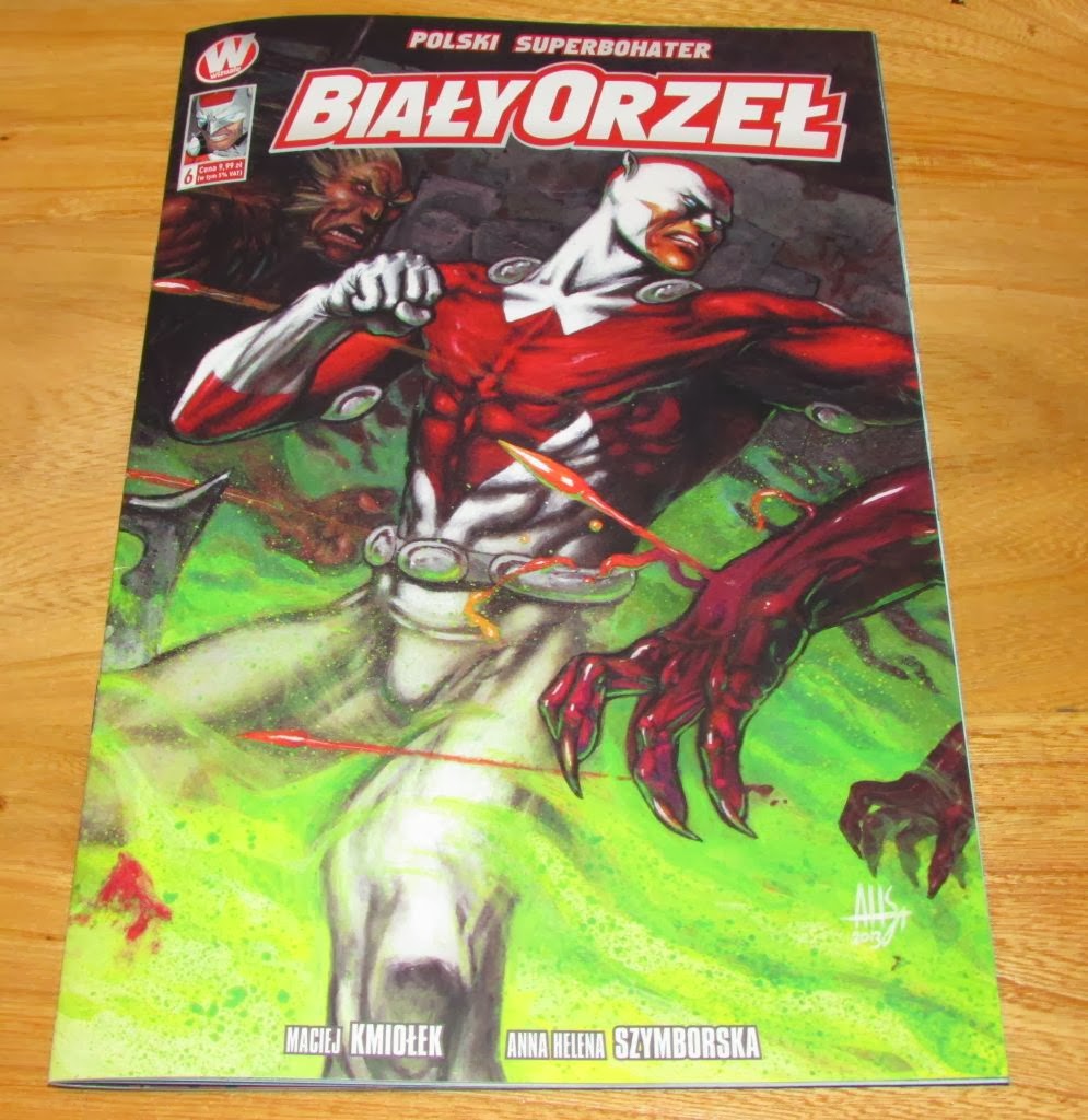 Dużo większy problem sprawia mi próba oceny części graficznej szóstej części przygód Orła. W porównaniu do poprzednich zeszytów, komiks wygląda zupełnie inaczej. Pierwsze numery charakteryzowały się ostrą, wyrazistą kreską i dużą ilości detali. Rysunki Anny Heleny Szymborskiej to zupełnie inna bajka. Odniosłem wrażenie jakby były tworzone tak troszkę w pośpiechu. Swoje – niestety bardzo drobne grosze dołożył kolorysta. Niektóre plansze są mało czytelne i jakby rozmazane, co mocno kontrastuje z poprzednimi zeszytami. Najbardziej boli mnie jednak brak detali. Wiele kadrów zupełnie pozbawione jest tła Rozumiem, że ściany, śnieg, pola, lasy i taka sceneria to nie jest dobre pole do popisu, ale pomarańczowo-brązowe tła przy scenach walki zupełnie mnie odrzucają. Nową oprawę graficzną ratuje jednak kilka rzeczy. Przezabawnie wyglądają miny, jakie stroi Aleks. Wygląda czasem tak głupkowato, że aż uroczo. Nie wiem czemu, ale o ile wcześniej Orzeł kojarzył mi się z Guardianem z Alpha Flight, tak w tym numerze przypomina mi Spider-Mana. Pewnie z powodu podobnego poczucia humoru. Bardzo solidnie wygląda też Licho (chociaż na jednym kadrze jest niepodobny sam do siebie), ale najbardziej spodobała mi się scena halucynacji Aleksa (nie licząc paskudnych, wybałuszonych niebieskich oczu). Złośliwi powiedzą, że to przez piersi Alicji. Ale nie. Chociaż może troszkę.