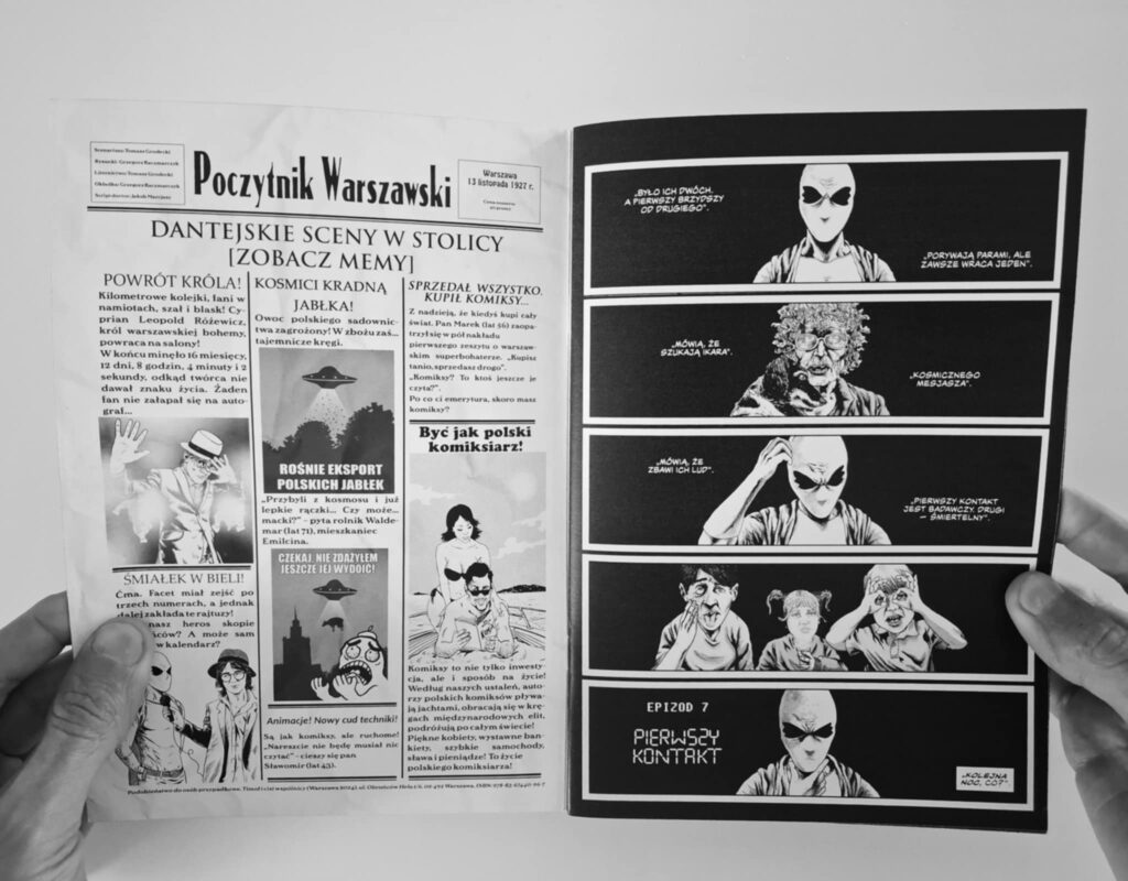 Czy zgodnie z sugestią w tytule mamy do czynienia z nowym początkiem dla warszawskiego superbohatera? Niekoniecznie — nie znajdziemy tu klasycznej genezy postaci, choć uparci mogą potraktować ten zeszyt jako punkt wejścia, bo da się go czytać bez znajomości poprzednich wydarzeń. Przygodę wymyśloną przez Tomasza Grodeckiego można by opisać jako „Ćma w kosmosie” — choć to określenie może być nieco krzywdzące. To nie jest zwykła podróż na orbitę i z powrotem. A właściwie… też, ale przy okazji autor sięga po teorie spiskowe i tworzy niepokojący klimat spotkania z obcą cywilizacją, z mocnym zachwianiem procesów myślowych.