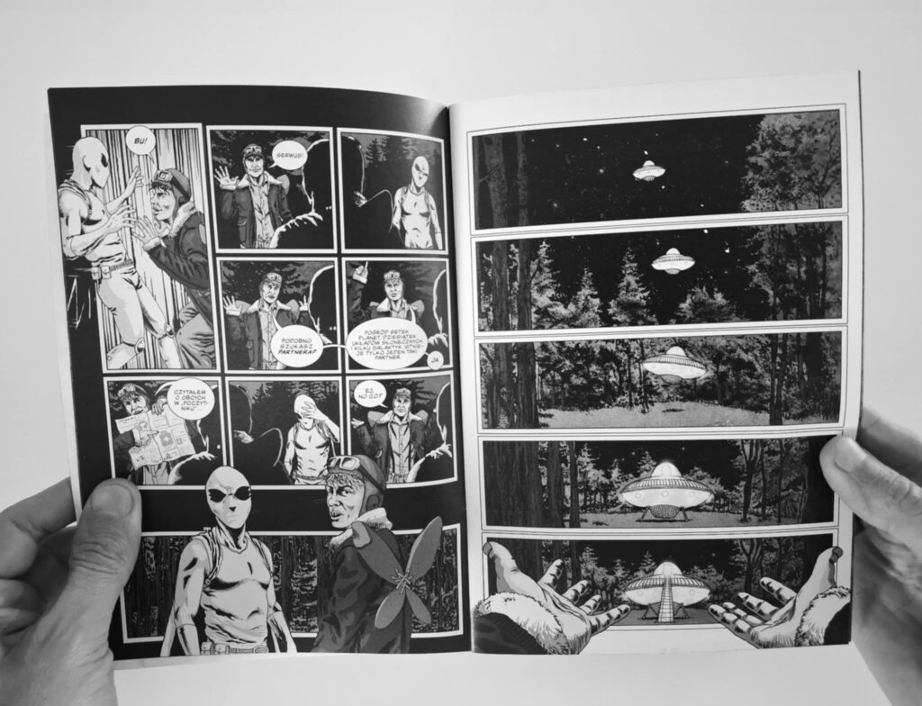Sekwencje – jak to u Grodeckiego – są bardzo wyraźne, zwłaszcza scena lądowania spodka kosmitów robi świetne wrażenie. Choć przyznam, że dopiero wczoraj, przeglądając zeszyt wspólnie z autorem, dowiedziałem się, co właściwie miały symbolizować te białe kropeczki przelatujące przez kadry. Sam bym na to nie wpadł. Mimo wszystko – spotkanie z obcymi powinno zostawiać w pamięci ślad jak z niejasnego snu. Rozmyty, pełen luk i niedopowiedzeń. I właśnie dlatego nie mam pretensji o brak jednoznaczności. Wręcz przeciwnie – dla mnie to działa.