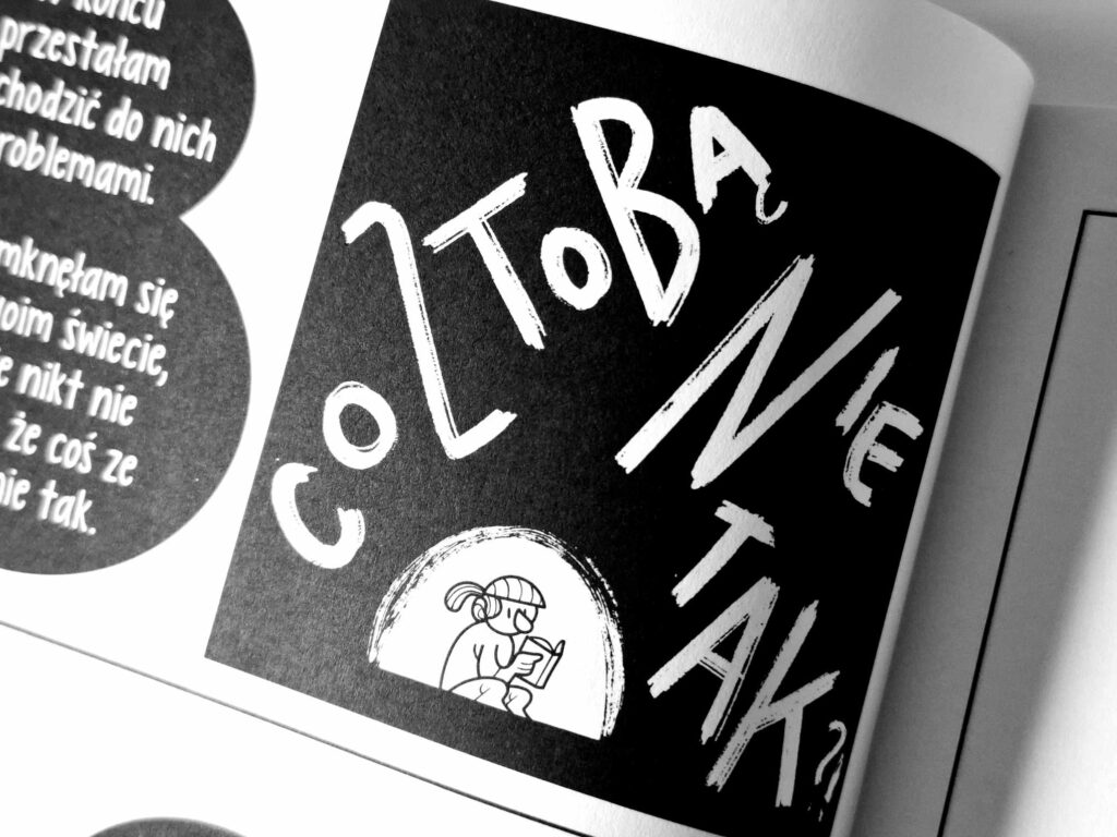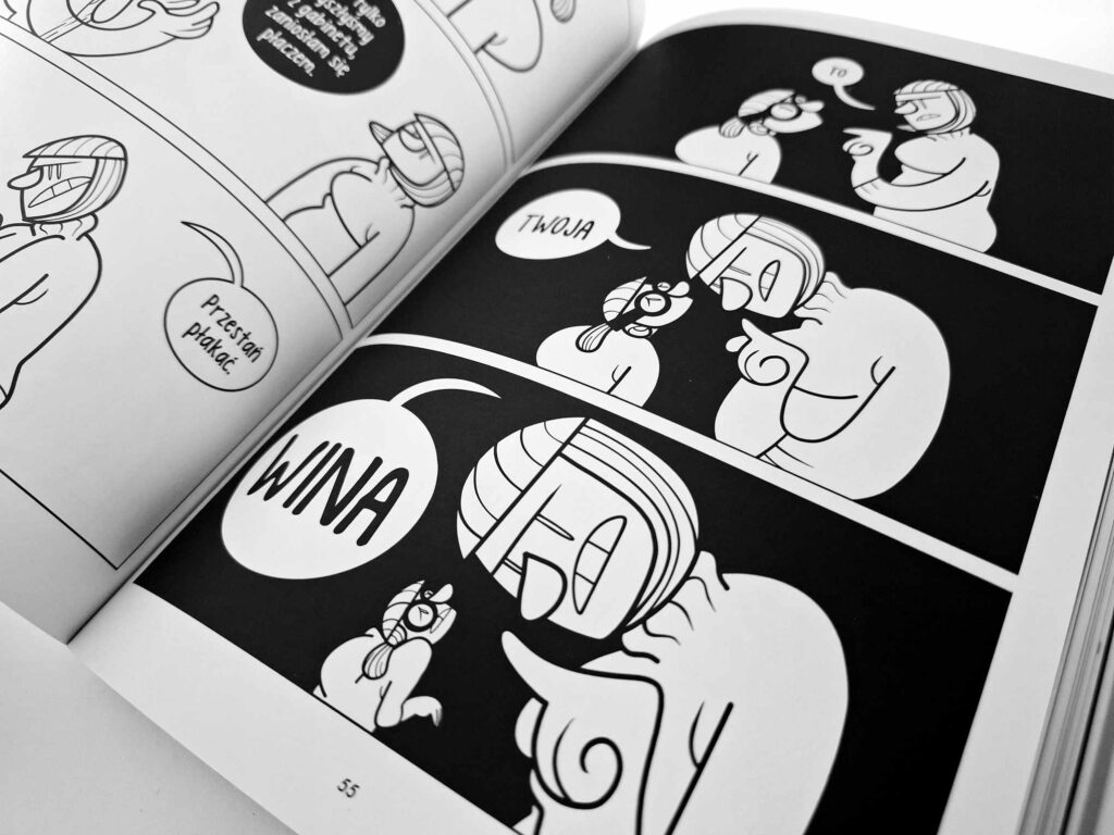 Także typografia tytułu sprawia wrażenie, że coś jest nie tak. Wszystkie te elementy odbieram jako celowe zabiegi, które podkreślają brutalną szczerość opowieści. Ten komiks jest, jaki jest – i nie jest ani zły, ani „do poprawy”. Taki właśnie ma być. W końcu nawet użycie czerni znajduje swoje uzasadnienie pod koniec albumu: „Mam czarno na białym, jak wiele znaczy dla mnie opinia innych.”