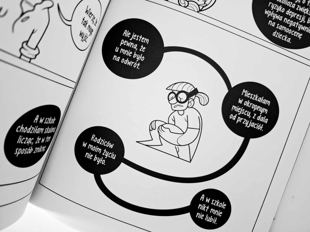 Ten komiks zaczyna się od pytania: „Co z Tobą jest nie tak?”. Brak akceptacji wśród rówieśników oraz wysokie oczekiwania wychowawcze sprawiają, że zaczynamy szukać problemu w sobie. To mechanizm, który znam doskonale – sam byłem najniższy w klasie, a wszelkie odchylenia od normy stają się pożywką dla drwin i docinków ze strony kolegów… czy raczej koleżków. Skoro wszyscy wokół wydają się fajni, dobrzy, ładni i inteligentni, a niektórzy nawet hołubieni przez własnych rodziców – wniosek nasuwa się sam: „Jestem zepsuty”.