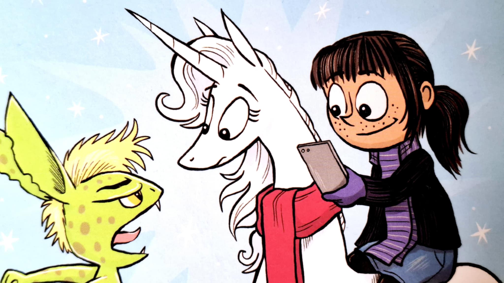 Bohaterki tego komiksu to bardzo specyficzna para, dobrana na zasadzie przeciwieństw. Bardzo lubię takie uzupełniające się duety. Fibi to zwyczajna, piegowata i mało popularna dziewczynka, uważana – przez siebie i innych – za dziwaczną. Oraz Marigold Niebiańskie Chrapy, czyli jednorożec. Jest zachwycająca – tyle powinno Wam wystarczyć. Czego chcieć więcej?