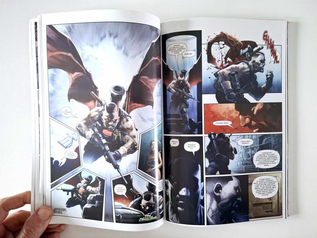 Pomimo ogromnego konfliktu, nie ma tu zbyt wielkiego tłoku, co zresztą widać już na okładce. Po stronie rządu USA walczą Ninjak oraz X-O Manowar – postać, którą czytelnicy mieli już okazję dobrze poznać (więcej tu – klik). Kosmita w zaawansowanej zbroi mocno kojarzy się z Iron Manem, choć jego pancerz jest znacznie potężniejszy – w końcu to kreacja samego Barry’ego Windsora-Smitha. Z kolei Bloodshot zostaje zmuszony do współpracy ze Zwiastunami – jego egzystencja opiera się na nanitach, które Livewire bez problemu kontroluje. Amanda czyni z niego żołnierza i popycha do przekraczania granic, aż w końcu Bloodshot staje się niemal aniołem zagłady – zarówno ze względu na swoje czyny, jak i wygląd.