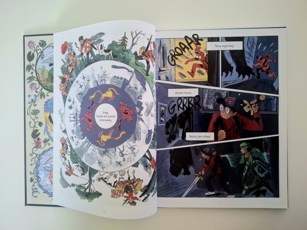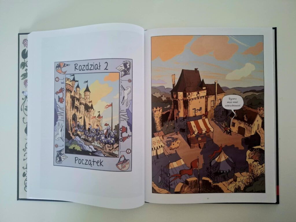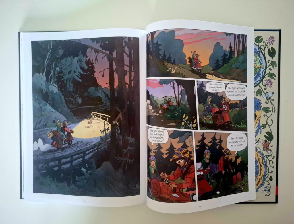 Wauter Mannaert zaraz po wprowadzeniu — urzekającej wklejki z ilustracjami wplecionymi w kolorowy, roślinny motyw — rozpoczyna opowieść w stylu przywodzącym na myśl średniowieczne gobeliny. Narracja płynie ze wstęg, a krąg łowów przedstawiono dosłownie, na pełnostronicowej ilustracji. Później ten styl delikatnie się wycofuje, ale komiks pozostaje graficznie spójny, z dużym naciskiem na mimikę postaci. W kadrach nie brakuje natury, ale pojawia się też odrobina współczesnej technologii — choćby znajomy z okładki czerwony skuterek. A rycerz dosiadający wściekłego jednorożca? Tego się nie spodziewałem, ale teraz wiem, że właśnie tego potrzebowałem.