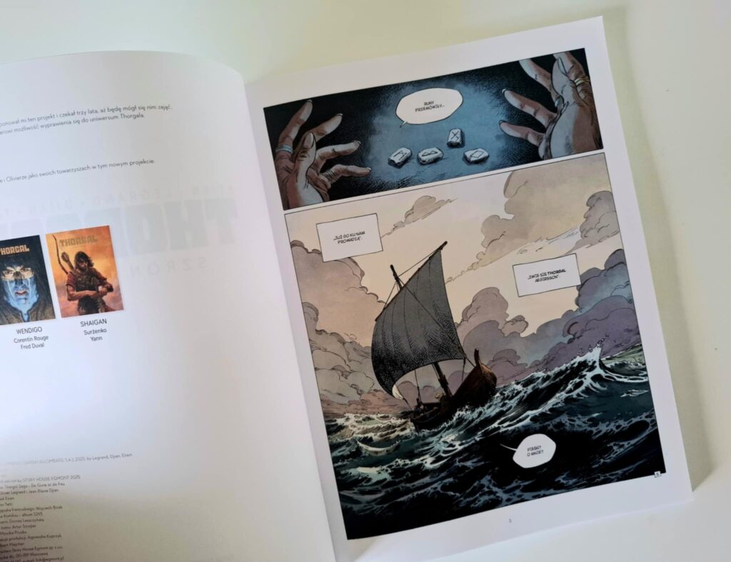 W uproszczonym postrzeganiu łatwo przyjąć, że im bardziej cartoonowa kreska, tym bardziej dziecinna treść — a rysowanie komiksów z patyczakami to już w ogóle obciach, bo jak tu wywołać zachwyt takimi środkami wyrazu? A jednak się da. Niemniej przyjrzyjmy się, co oferuje David Etien wspólnie z kolorystą Bruno Tattim. Już w pierwszym kadrze pojawiają się runy rozświetlające mrok utkany z gęstej pajęczyny kresek. Dalej widzimy łódź Thorgala, prującą fale niczym nieodbiegające od tych, do których przywykliśmy w klasycznych tomach — Thorgal wciąż porusza się po tych samych wodach. Ale wystarczy spojrzeć na chmury w tle, by dostrzec inne podejście. A gdy dochodzi do pierwszego zbliżenia na twarze, zmiana stylistyczna staje się już zupełnie oczywista.