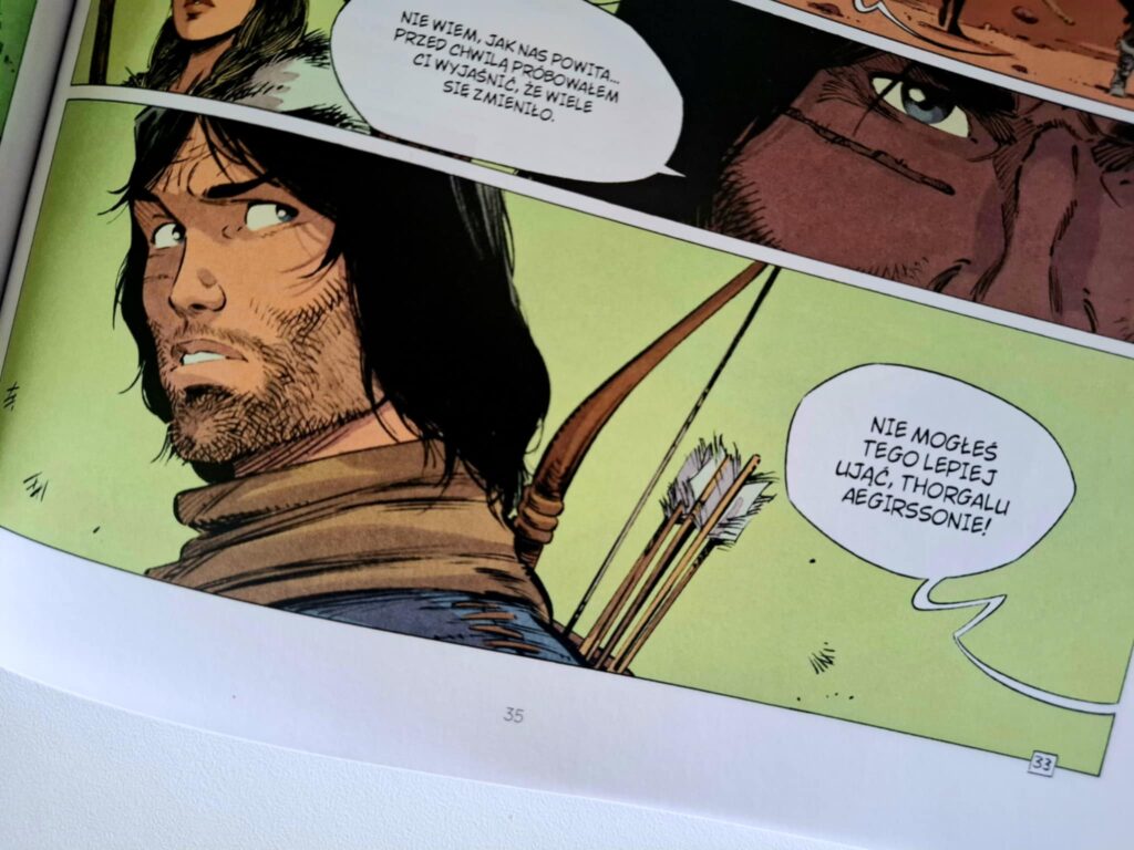 Czy Thorgal powinien wyglądać dokładnie tak, jak narysował go Grzegorz Rosiński? To dobre pytanie — i nie mam na nie jednoznacznej odpowiedzi. Przecież sam Rosiński przez lata rysowania serii zmieniał swoje podejście do postaci: jego kreska ewoluowała, a sposób nakładania koloru przeszedł drogę od klasycznych technik aż do pełnego rozmachu malarskiego stylu z kolorem bezpośrednim.
