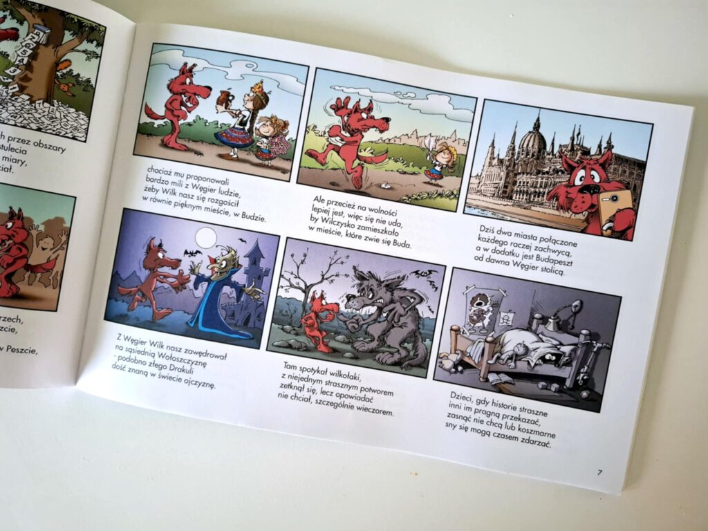 Aby opowiedzieć historię zwierzęcia, które zawędrowało aż do herbu miasta, autorzy cofają zegar aż do czasów założenia Rzymu – gdy spod karmiącej wilczycy został wykopany prawowity potomek, by zrobić miejsce dla Remusa i Romulusa.Podczas swojej wędrówki Czerwony Wilk wpada w kolejne znane legendy i baśnie. No bo skoro mamy wilka, który włóczy się po lasach, szkoda by było, gdyby nie spotkał dziewczynki w czerwonym płaszczyku. Choć – przyznam – Drakuli to się raczej nie spodziewałem. A jednak! W końcu jego zamek rzeczywiście leżał po drodze.