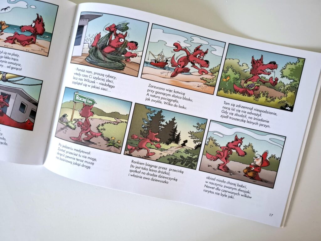 Nie gardzę taką formą komiksową, ale te wierszyki, które znalazły się pod obrazkami, najchętniej bym wymazał i zastąpił zgrabnymi, nierymowanymi zdaniami. Rytmu i tak często nie udaje się utrzymać, a rymy bywają wymuszone. Rozumiem, że to książeczka raczej dla młodszego czytelnika — może rymowanki łatwiej wpadają w ucho młodemu umysłowi — ale ja sam miałem momentami problem ze zrozumieniem i musiałem wracać do niektórych fragmentów.