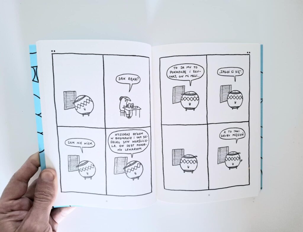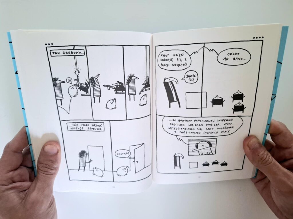 Świdziński świetnie ilustruje te dźwięki, nadając im niemal fizyczną obecność. Całość przesiąknięta jest marazmem – codzienność bohaterów przypomina zapętlony bezsens, w którym nawet wieść o czyimś zniknięciu nie robi większego wrażenia. Dialogi powoli osuwają się w absurd, odsłaniając pustkę i mechaniczność codziennych rytuałów. Ten fragment komiksu działa jak soczewka na życie „zwykłych ludzi” – tych, którzy nie wynajdują fal niszczących świat, a raczej próbują przetrwać dzień, rozmawiając o niczym.