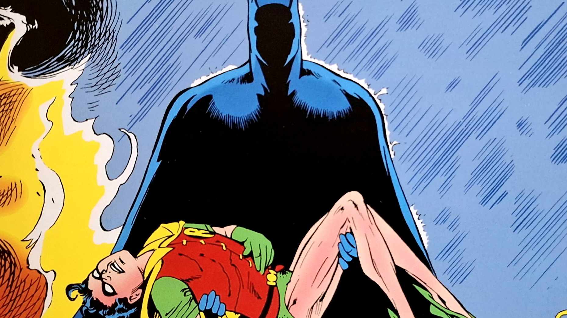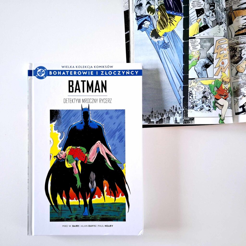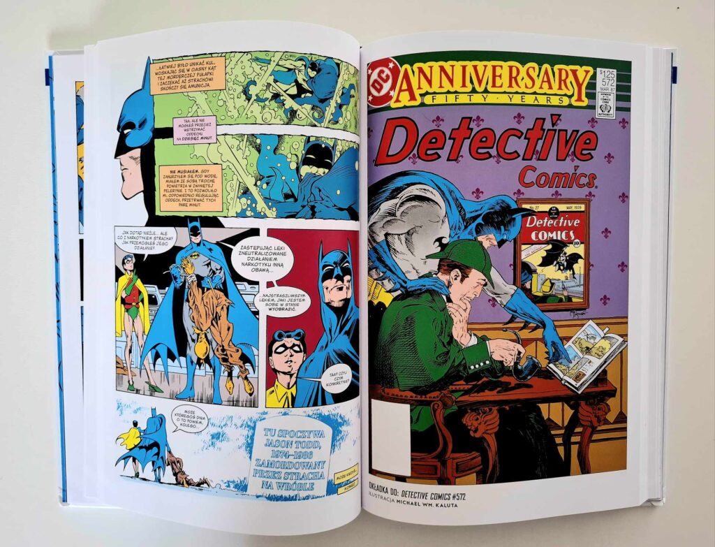 Jak restart, to i nowa geneza. Ta pojawia się w Detective Comics #574, którego okładkę widzimy również na froncie albumu. Batman z obliczem skrytym w cieniu, a na pierwszy plan wyłania się bezwładna sylwetka Robina, wyciągniętego z płomieni. To jednoznaczna zapowiedź nadchodzącego mroku, który zaleje łamy nietoperzowej serii, zwiastując ikoniczną historię „Śmierć w rodzinie”.