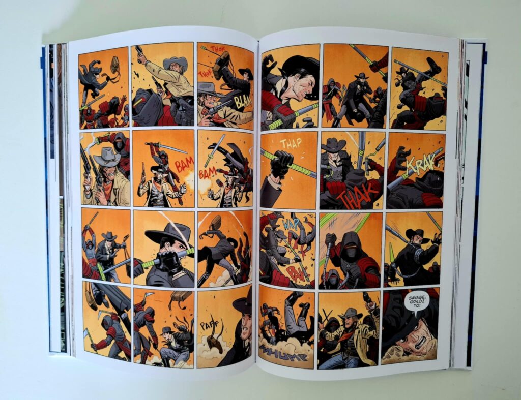 Wraz ze zmianą scenerii dochodzi też do zmiany kostiumów – bo peleryna Batmana nie zawsze okazuje się najpraktyczniejsza. Sprawdza się przede wszystkim w mrokach Gotham. Na Thanagarze wszyscy latają, więc czarna płachta ustępuje miejsca skrzydlatej uprzęży. A na Dzikim Zachodzie maska to symbol kogoś, kto coś ukrywa. Szykowny czarny garnitur z epoki to chyba moje ulubione wdzianko Batmana z tego albumu – ale do najważniejszej zmiany dochodzi w przeprowadzonym z ogromnym rozmachem finale.