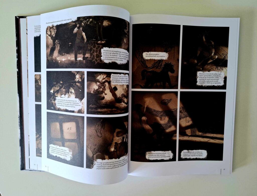 Judyta Sosna (ilustratorka komiksów Czarna studnia, Spodouści) używa koloru, by odróżnić fikcję od rzeczywistości. Z czasem jednak autor grozy, pogrążony w samotności, zanurza się coraz głębiej w świecie i w tłumie stworzonych przez siebie koszmarów. Granica między dwoma wymiarami zaczyna się zacierać, a historia płynie wśród cichych, oszczędnych kadrów, z których bije trwoga długiego wpatrywania się w puste okno. W końcu — po długiej kontemplacji — można w nim dostrzec coś niepokojącego.