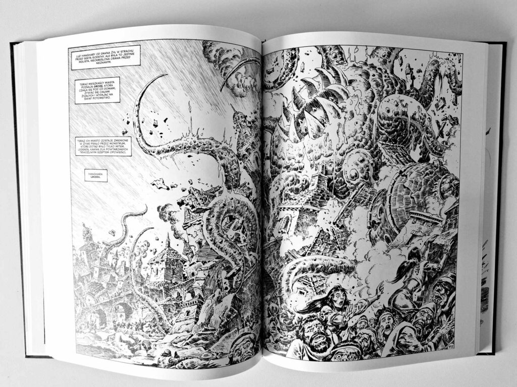 W dwóch pozostałych epizodach Conan zostawia dzicz za plecami i wybiera się do miasta, a właściwie dwóch różnych miast. W „Mieście szczurów” ma pomścić śmierć spadkobiercy chana; pojedynek i pościg po dachach to coś, co Gary Kwapisz mógłby spokojnie zaprezentować w jakimś komiksie superbohaterskim. Natomiast najlepszym graficznie z tej trójki jest środkowy epizod zilustrowany przez Erniego Chana. Co prawda „Pełzający bóg” bardziej pasowałby do ksiąg H.P. Lovecrafta niż Roberta E. Howarda, bo pradawny potwór mieszkający pod miastem i żądający ofiary niechybnie inspirowany jest Cthulhu, ale nadal — grafiki są kapitalne, a rozkładówka z mackowatym potworem rozrywającym miasto cieszy oko.