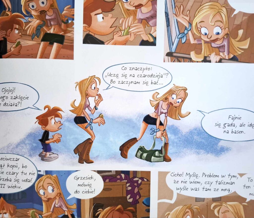 Lubię czasem zajrzeć do serii dla dzieci — choć robię to coraz rzadziej. Założenia tej opowieści są dość proste: żywiołowy Grzesiu o ognistej fryzurze musi zmagać się z wyzwaniami na dwóch frontach. Z jednej strony — rodzinne napięcia. A tym razem sprawy się komplikują, bo… co może być gorsze od starszej siostry? Oczywiście — dwie starsze siostry, z których jedna to jakby żywy zestaw jej najgorszych cech, skondensowany w magicznej formie.