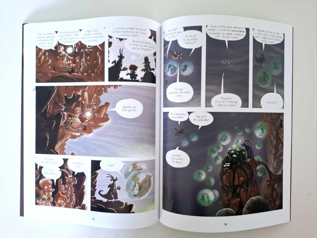 W środku czeka 48 ładnie pokolorowanych, przyjemnych dla oka plansz autorstwa Camboniego. Są jasne i kolorowe, ale też nieco mroczniejsze, osnute cieniem. Nawet pajęcze, olbrzymie monstrum — choć oficjalnie nazywane „paskudnym” — wypada ilustracyjnie doskonale. Co prawda jego rola nie należy do sympatycznych, bo ma wysysać magię z zaczarowanych istot… ale! Na szczęście Grzesiowi udaje się przeciągnąć mroczniaka na swoją stronę. A starsze siostry, jak to starsze siostry — pająków nie znoszą!