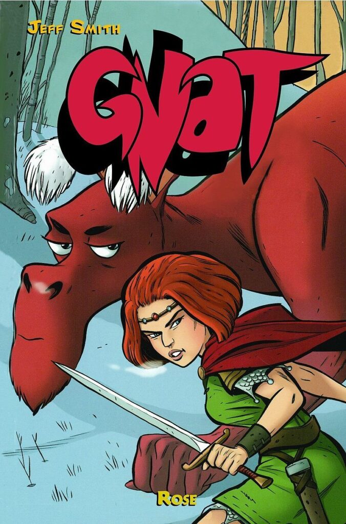 To Jeff Smith jest sprawcą tego całego zamieszania. To w jego umyśle pojawiły się białe ludziki, podróżujące po Dolinie, leżącej w miejscu znanemu tylko autorowi. Bestsellerowa seria Gnat zawitała także i do nas, w pięknych trzech, grubych tomiszczach. Egmont, nie zwalniając tempa, wydał też spin-off głównej serii o wspomnianym już tytule Gnat. Rose. Próżno jednak szukać w środku sympatycznych mieszkańców Gnatowa. Autor tym razem skupia się na drugoplanowej dotychczas postaci: Babci Ben, w młodości noszącej imię Rose Harvestar. W środku znajdziemy odpowiedzi na nurtujące pytania. Jak wyglądało dzieciństwo babci? Jakie wydarzenia ukształtowały jej szorstki charakter? I najważniejsze, co poróżniło ją z tajemniczym czerwonym smokiem?