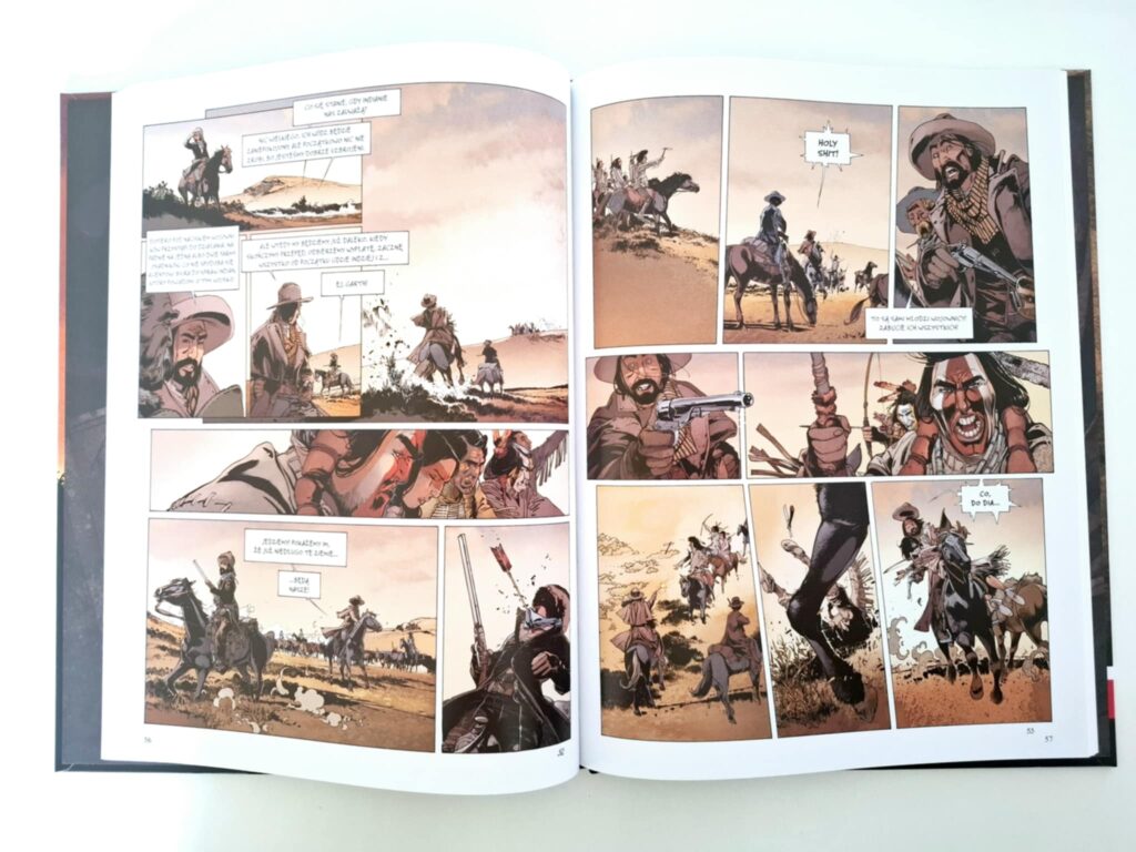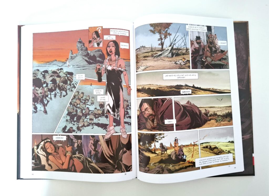W tle wciąż pobrzmiewa wysoka cena, jaką przyszło zapłacić za sprowadzenie postępu na Dziki Zachód. Im bliżej końca albumu, tym wyraźniej słychać tę nutę. Już pierwsza plansza wita czytelnika majestatyczną ciszą — z unoszącym się nad prerią pyłem. Ale to tylko chwilowe. Zaraz bezdroża przetnie kolej, a stalowe, ciężkie lokomotywy będzie widać i słychać z daleka. Szlak przecierają pionierzy, a tuż za nimi — cywilna ludność, wyprzedzająca fakty, podążająca za „amerykańskim snem”. Bo to proste: jesteś gdzieś pierwszy, masz największą szansę na znalezienie swojego miejsca i wzbogacenie się.