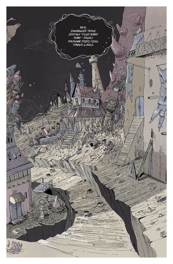 Wszystkie te funkcje pełnią przewspaniałe rysunki. Warstwa graficzna tego dzieła zapiera dech w piersiach. Wielość detali, sąsiadująca z przestrzennością ilustracji sprawiają, że pragnę zogniskować wzrok poza kadr. Zostawić, chociaż na chwilę, wątek główny i poświęcić się eksploracji świata. Trudno jednak mi jednoznacznie stwierdzić, czy gdybym rzeczywiście mógł, to odwróciłbym się od dramatycznego przebiegu sytuacji. Nadal labirynt kresek i kolorów oferuje niesamowicie zawiłą podróż. Nie czytając komiksu, tylko wpatrując się w same kadry, przebyć można rozległe krainy.