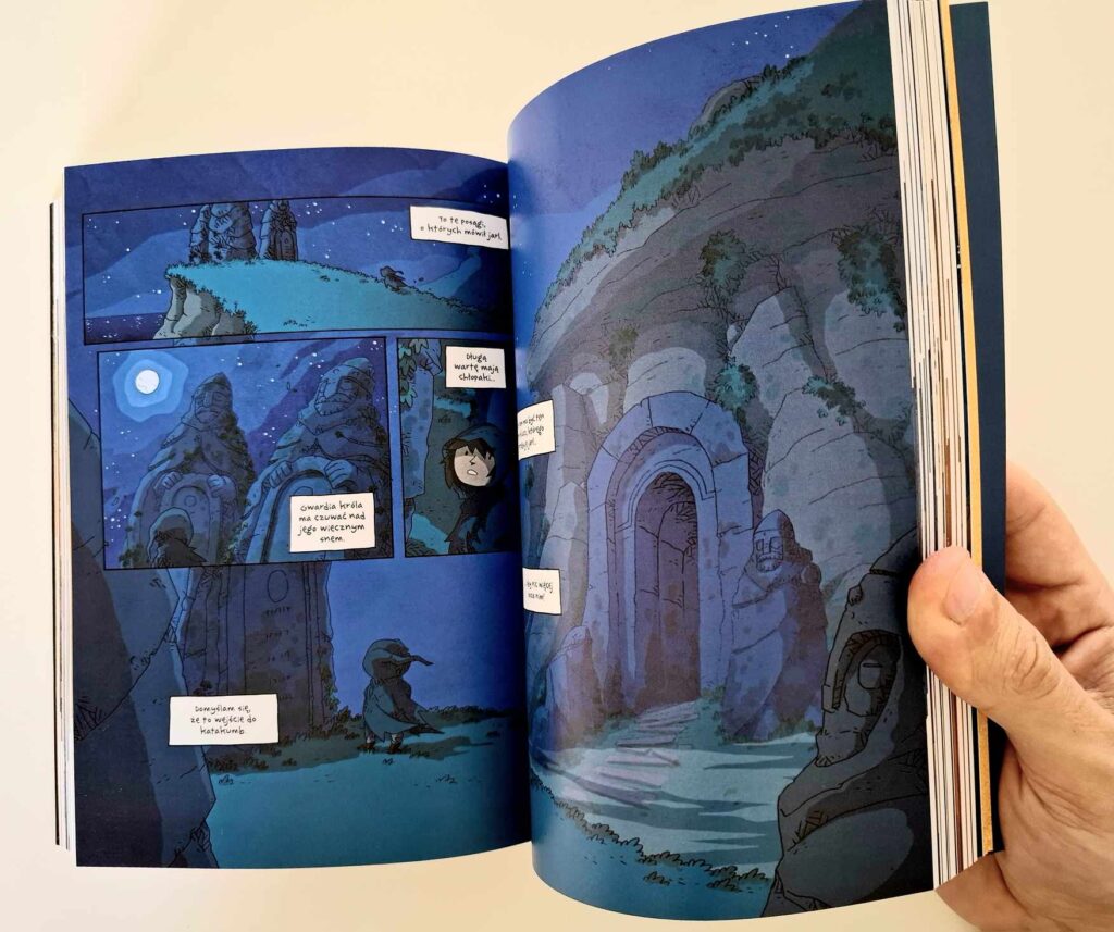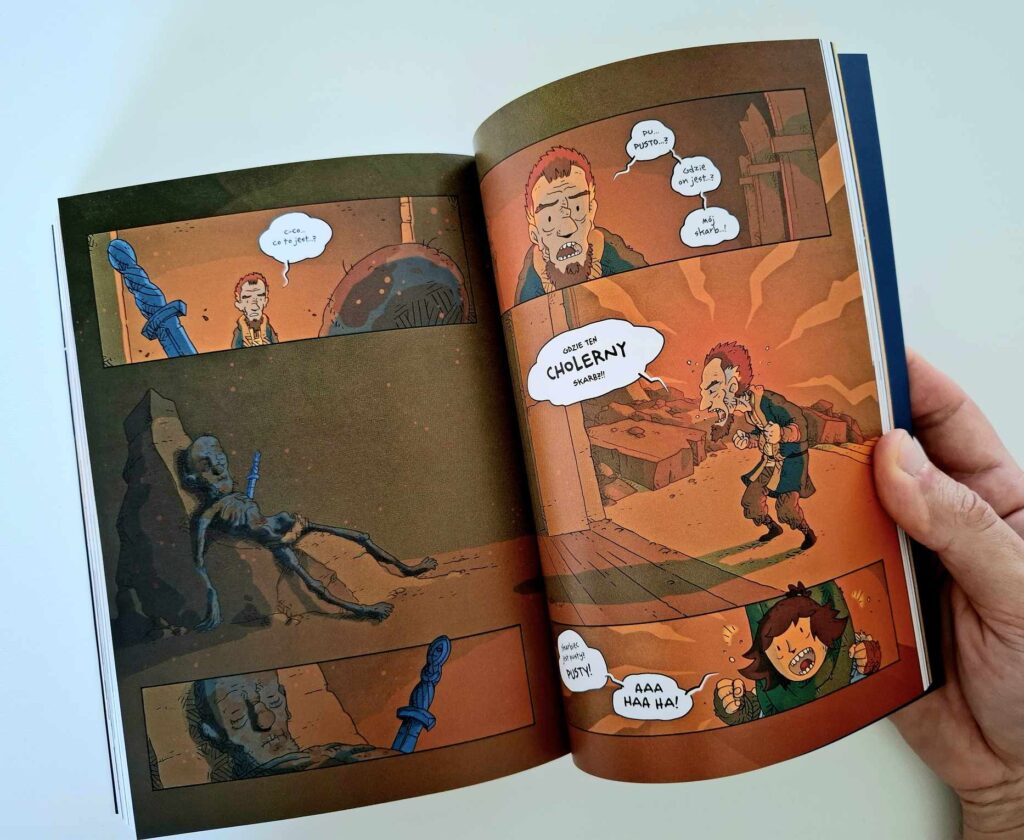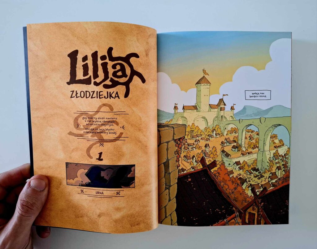 „Lilja złodziejka. Skarb trzech królów” – to komiks dla dzieci? No, nie do końca. Kultura Gniewu sugeruje odbiorcę 9+ i w zasadzie to dobra poprzeczka — tylko trzeba być gotowym na to, że dzieciaki mogą zapytać: „Tato, ale co to ten burdel?”. To właściwie jedyny moment, który sugeruje nieco dojrzalszego odbiorcę niż rekomendowany. No chyba że Wasza dziatwa wyjątkowo wrażliwa jest na kościotrupy (w co wątpię) albo przebijanie mieczem. Bo i tego tu trochę jest. Nawet drobniejsze rany przedstawione są dość realistycznie. Lilja po jednej z misji wraca z ciętą raną i autor o niej nie zapomina — choć podejrzewam, że oprócz kąpieli przydałoby się tu raczej porządne szycie.