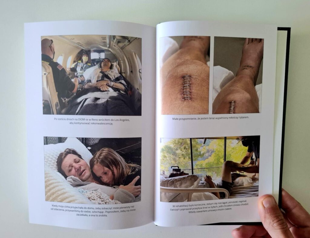 I w jakich okolicznościach? Żyjemy w czasach, w których informacje rozchodzą się błyskawicznie — czasem wręcz trzeba je powstrzymywać, by nie obiegły całej kuli ziemskiej w kilka chwil. Oczywiście słyszałem wcześniej w mediach o wypadku Rennera, ale szczegółów nie znałem. Zresztą wokół życia osób publicznych często narasta szum informacyjny, dlatego do każdej wiadomości podchodzę z rezerwą. Tu z pomocą przychodzi książka, w której sam Renner szczegółowo opisuje przebieg wypadku i jego okoliczności. Widać, że mierzy się z bolesnymi wspomnieniami. Opis miażdżenia ciała bardziej przypomina scenę z horroru niż fragment typowej autobiografii. Sielankowa, noworoczna atmosfera rodzinnego zjazdu zostaje brutalnie przerwana. Na śnieżnobiałym puchu pojawia się krew — i to w przerażająco dużych ilościach.