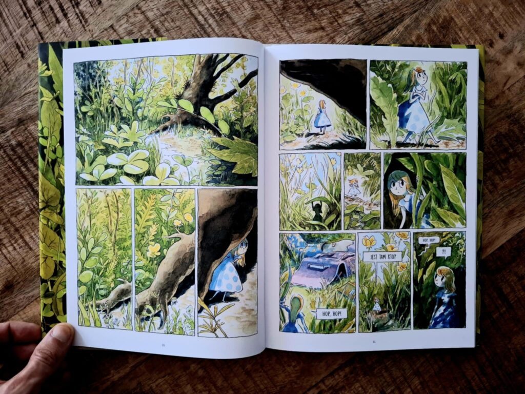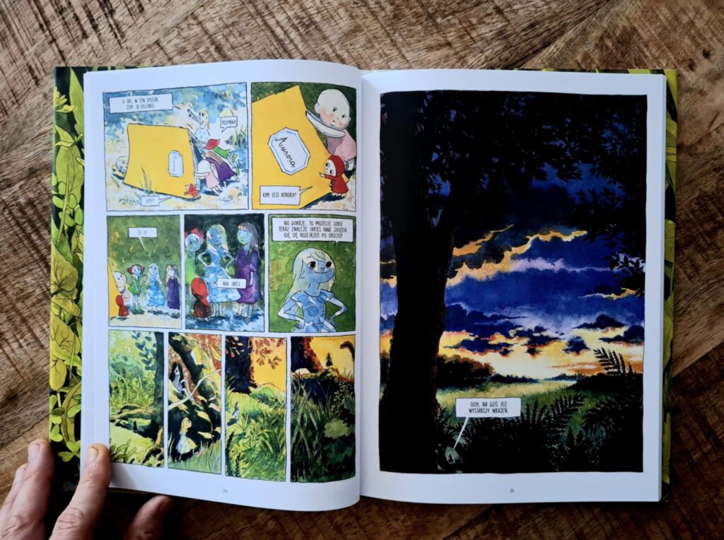 Warstwa graficzna — choć pełna zgnilizny, wijących się czerwi i scen obżerania się robactwem (plus, dodajmy, dość chybiony pomysł karmienia się przez ptaki) — jest po prostu piękna. Kerascoët to nie jeden artysta, lecz pseudonim duetu: Marie Pommepuy i Sébastiena Cosseta, prywatnie małżeństwa, które poznałem już dzięki Pięknej — u nas wydanej w wersji monochromatycznej, z czernią, bielą i sepią jako jedynym akcentem kolorystycznym. W Pięknej ciemności mamy już pełną paletę barw, która – w połączeniu z miękkimi rysunkami, dużymi oczami postaci i ich uroczymi buźkami – tworzy silny kontrast z brutalnym scenariuszem. I to właśnie ten rozdźwięk działa najmocniej.