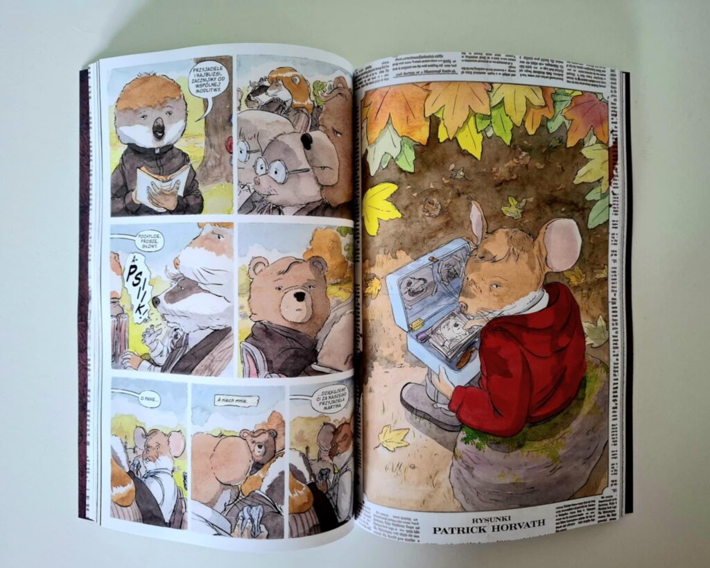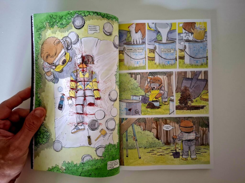 Tymczasem „Pod drzewami gdzie nikt nie widzi” przyciąga uwagę wyjątkową oprawą graficzną – czarującą, choć w scenach ćwiartowania zwłok potrafi być brutalnie dosadna. Oczywiście antropomorficzne zwierzęta nie zawsze oznaczają treści dla dzieci. Przykłady? Choćby Blacksad, będący pełnokrwistym kryminałem noir, czy animowane Happy Tree Friends, które serwowało ekstremalną przemoc w cukierkowym stylu, przyprawiając widzów o zawroty głowy.