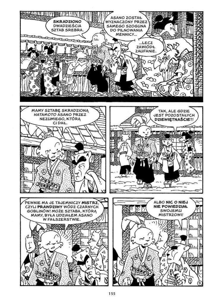 Stan Sakai serwuje nam przepyszne, detektywistyczne danie, na które składa się szereg składników. Morderstwo, drobne kradzieże, poczynania japońskiego Robin Hooda Nezumiego, otrucie oraz miasteczkowy gang. Wszystko tworzy piękną całość, za którą kryje się tajemniczy typ, herszt bandy. Mało? Na deser są jeszcze dwie historyjki o Chibim Usagim. Tu ronin, zgodnie z mangową tradycją, jest małym królikiem o przesadnie dużej głowie. Nie sposób się przy nich nie uśmiechnąć, zwłaszcza że historyjki są prześmieszne. Jest po prawdzie jeszcze galeria okładek i szkiców, dodatki, które zwykłem ignorować.