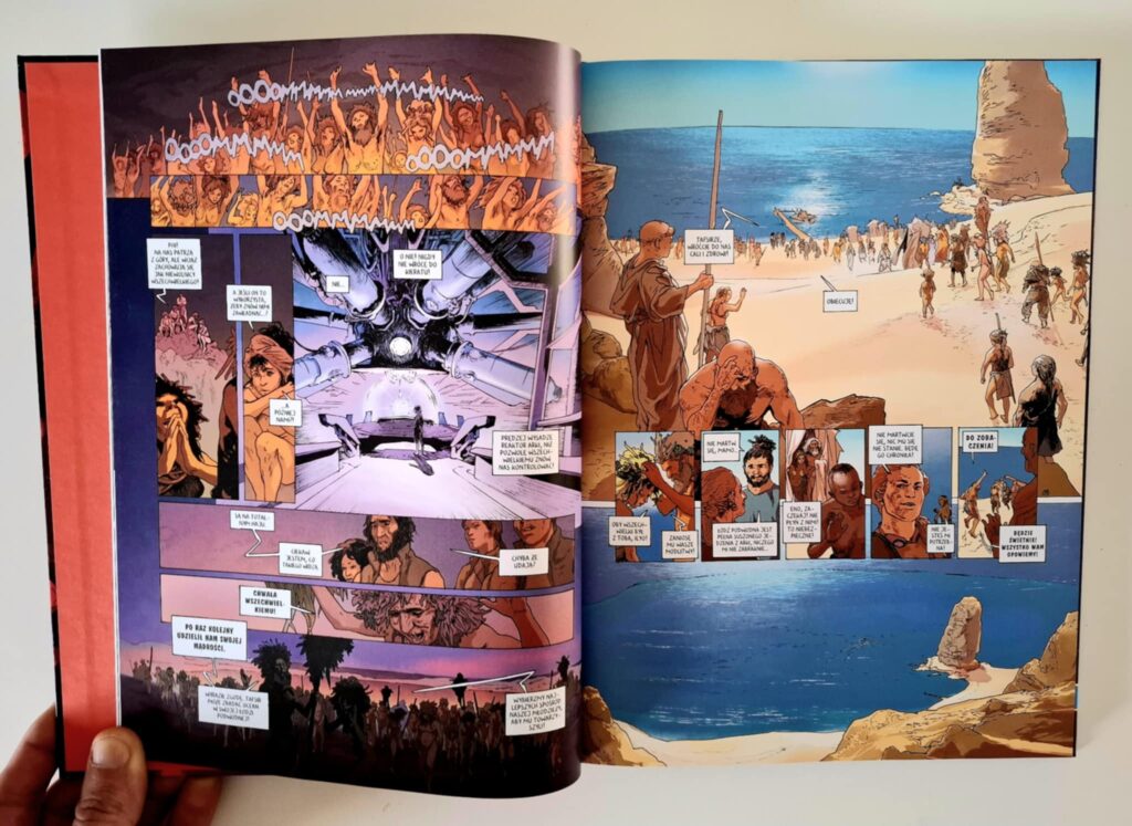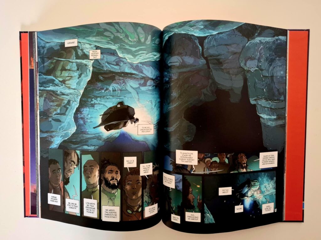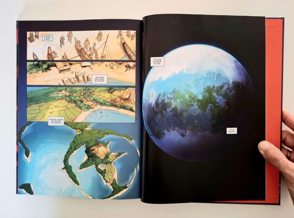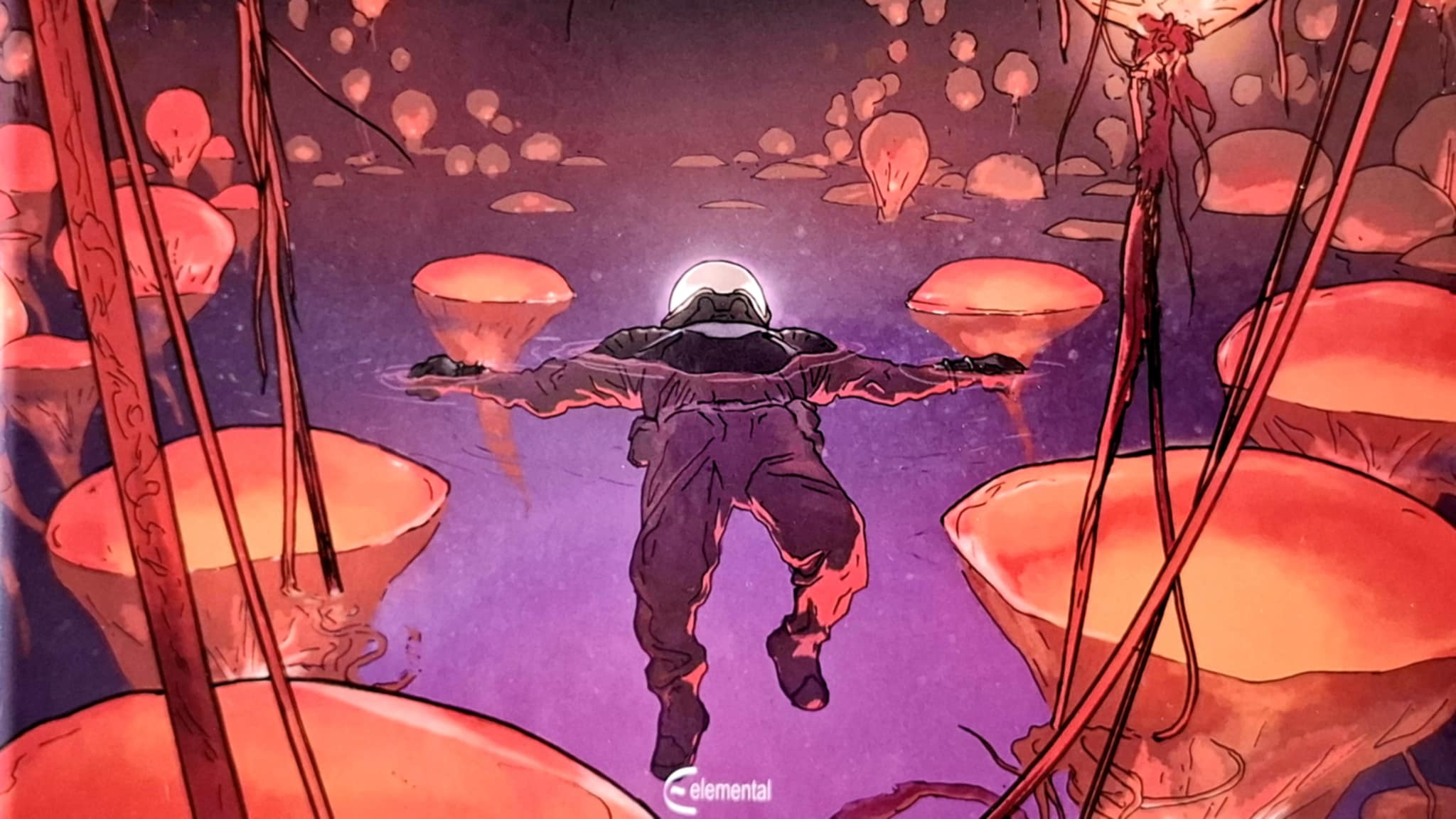 Z jednej strony mamy więc eksplorację planety, która staje się pretekstem do ukazania zapierających dech w piersiach kadrów – zarówno znad powierzchni oceanu, jak i z jego głębin. Oglądamy prawdziwe wizualne spektakle, jak choćby ten z okładki: zarodniki unoszące się w powietrzu niczym latające lampiony. Autorzy wprowadzają też niezwykłych strażników przypominających połączenie meduz i kałamarnic, a fabuła zaczyna zmierzać w stronę katastrofy ekologicznej i planetarnego zagrożenia.